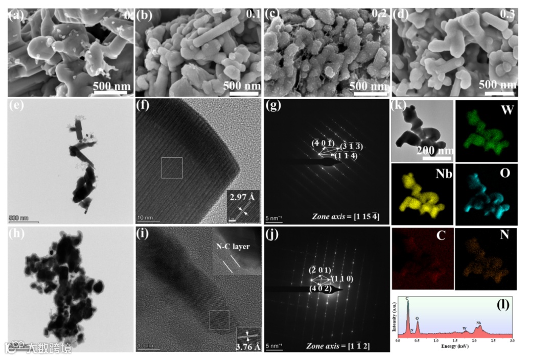图1 材料形貌与结构表征:(a-d) WNb12O33和WNb12O33@N-C的SEM图像,(e-g) WNb12O33和(h-j) 0.2WNb12O33 @N-C的TEM、HRTEM和SAED图像,(k , l) EDS元素mapping图像和0.2WNb12O33@N-C的W、Nb、O、C和N元素的EDS。