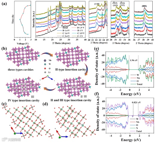 图7 反应机理与理论计算:非原位XRD、晶体嵌锂过程、DFT计算结果。