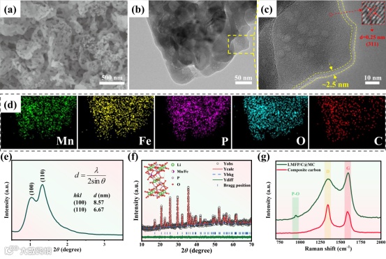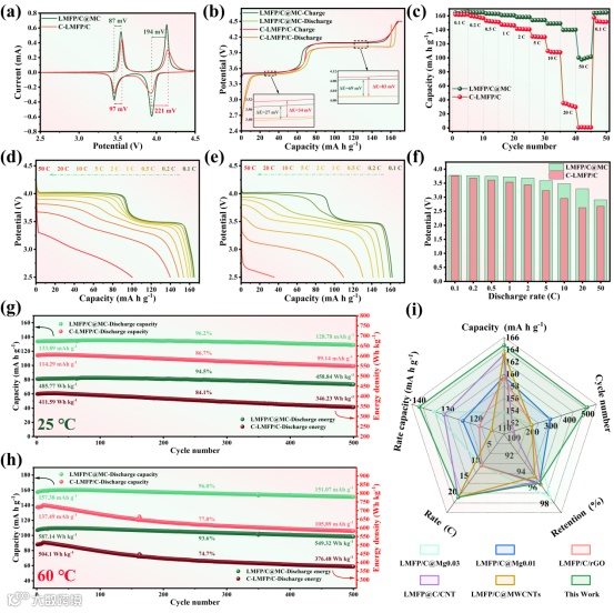 为了解决上述问题,四川大学新能源材料与电池研究团队在Carbon上发表题为“A 3D continuous mesoporous carbon framework enhances electronic/ionic kinetics of LiMn0.6Fe0.4PO4 cathode for high-performance lithium-ion batteries”的研究文章。本文设计开发了一种内嵌于3D连续介孔碳框架的超细LMFP/C纳米颗粒复合结构(LMFP/C@MC)。3D连续的碳框架能够为LMFP颗粒之间的电子传输提供快速的传输通道,增强电子动力学,并调控充放电过程中的体积变化和颗粒团聚;介孔有利于电解液的浸润和Li+的扩散,增强离子动力学;超细的LMFP纳米颗粒能够缩短电子和离子在体相中的传输路径,并缓解充放电过程中产生的结构应力,这种独特的结构显著增强了电子/离子传输能力,提高了材料的结构稳定性。制备得到的LMFP/C@MC表现出超高的比容量(0.1 C,164.69 mAh g-1)、良好的倍率性能(20 C,139.79 mAh g-1)和优异的常温和高温能量密度稳定性(2 C,500次循环,能量密度保持率:25 ℃,94.5%和60 ℃,93.6%)。