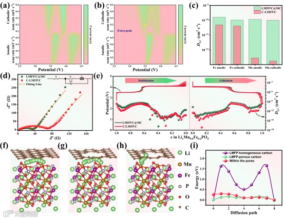 传统的致密碳包覆层易形成LMFP颗粒与碳层之间的离子扩散“死胡同”,其锂离子扩散能垒高达1.6 eV。本研究通过多尺度调控技术实现突破,超细LMFP颗粒将体相锂离子迁移距离显著缩短,碳框架内构建5-10 nm介孔作为离子传输主通道,LMFP颗粒与碳层之间的锂离子扩散能垒降至0.3 eV以下,实现了50 C(>100mA h g-1)超高倍率性能。