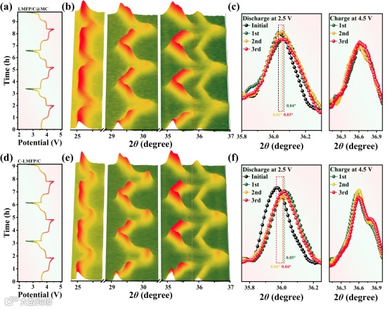 在60 ℃高温循环测试中,LMFP/C@MC展现出卓越的结构稳定性:500次循环后容量保持率高达96.0%,能量密度保持率高达93.6%,无明显电压衰减,远优于商业化材料(77.0%和74.7%)。通过电化学原位XRD研究发现,商业化LMFP/C在4.5 V高压下发生显著的活性相分离,且放电结束后与初始结构偏差较大。而LMFP/C@MC的原位XRD结果显示,其橄榄石结构具有良好的结构可逆性,且高压状态下无活性相分离,表明3D介孔碳框架及超细纳米颗粒的双重作用有效维持了材料在高温及高电压下的结构完整性。