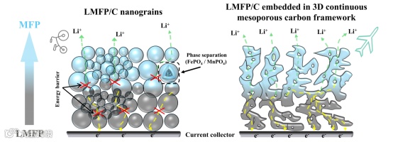 图1. 传统碳包覆LMFP与内嵌于3D连续介孔碳框架的LMFP。