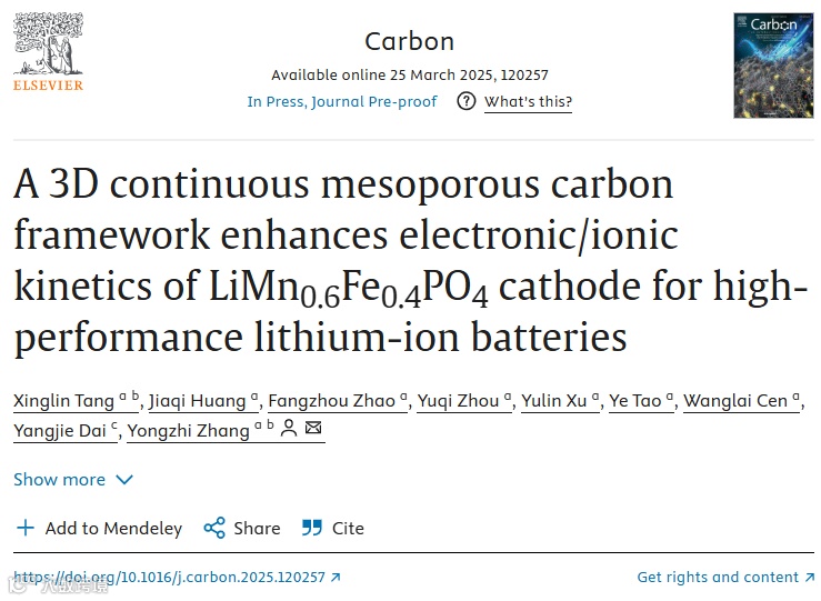 “A 3D continuous mesoporous carbon framework enhances electronic/ionic kinetics of LiMn0.6Fe0.4PO4 cathode for high-performance lithium-ion batteries”