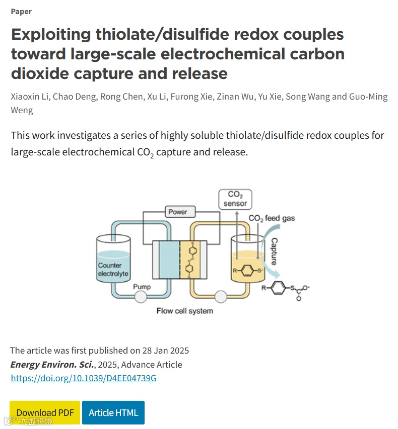 Li, X., Deng, C., Chen, R., et al. (2025). Exploiting thiolate/disulfide redox couples toward large-scale electrochemical carbon dioxide capture and release. Energy & Environmental Science.