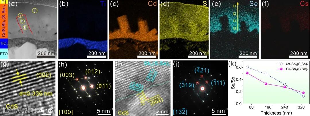 图2. Sb2(S,Se)3/CdS NAs异质结薄膜中元素分布、晶格间距及Se/Sb原子比变化表征