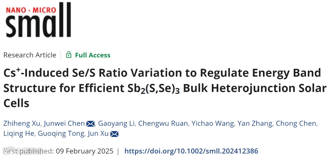 基于此,合肥工业大学陈俊伟副教授与许俊教授在材料领域国际著名学术期刊《Small》上发表了题为"Cs⁺-Induced Se/S Ratio Modulation for Energy Band Engineering in High-Efficiency Sb₂(S,Se)₃ Bulk Heterojunction Solar Cells"的最新研究成果。该研究通过在水热合成的单晶CdS纳米棒阵列上原位沉积Sb₂(S,Se)₃光吸收层,成功构建了三维互穿结构的Sb₂(S,Se)₃/CdS体异质结光伏器件。创新性地引入碱金属Cs⁺离子诱导调控Sb₂(S,Se)₃薄膜中Se/S原子比的策略,该策略明显提高了Sb₂(S,Se)₃薄膜的晶体尺寸,降低了其缺陷态浓度,优化了Sb₂(S,Se)₃薄膜垂直方向的能带结构排布。同时,该策略抑制了Sb2(S,Se)3光伏器件中的光生载流子的复合而延长了载流子寿命,减小了漏电流的产生。这种收窄的Se元素浓度梯度分布抑制了光生空穴传输的能级势垒,而促进了光生载流子的高效传输、分离和收集。最终,采用碱金属Cs+离子诱导的Se/S原子比变化策略的Sb2(S,Se)3光伏器件获得了8.23%的光电转换效率,这是目前基于体异质结Sb2(S,Se)3光伏器件的最高效率。