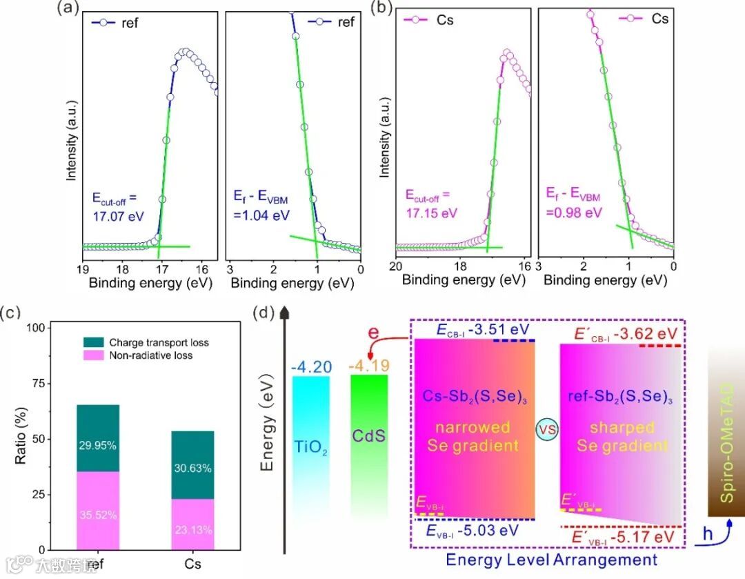 图4. Sb2(S,Se)3薄膜中能带结构排布、器件Voc损失因子表征