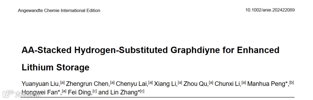 近日,北京化工大学范红玮教授、华北电力大学彭曼华教授和汉诺威大学张琳教授合作,在国际知名期刊Angewandte Chemie International Edition上发表题为“AA-Stacked Hydrogen-Substituted Graphdiyne for Enhanced Lithium Storage”的研究论文。