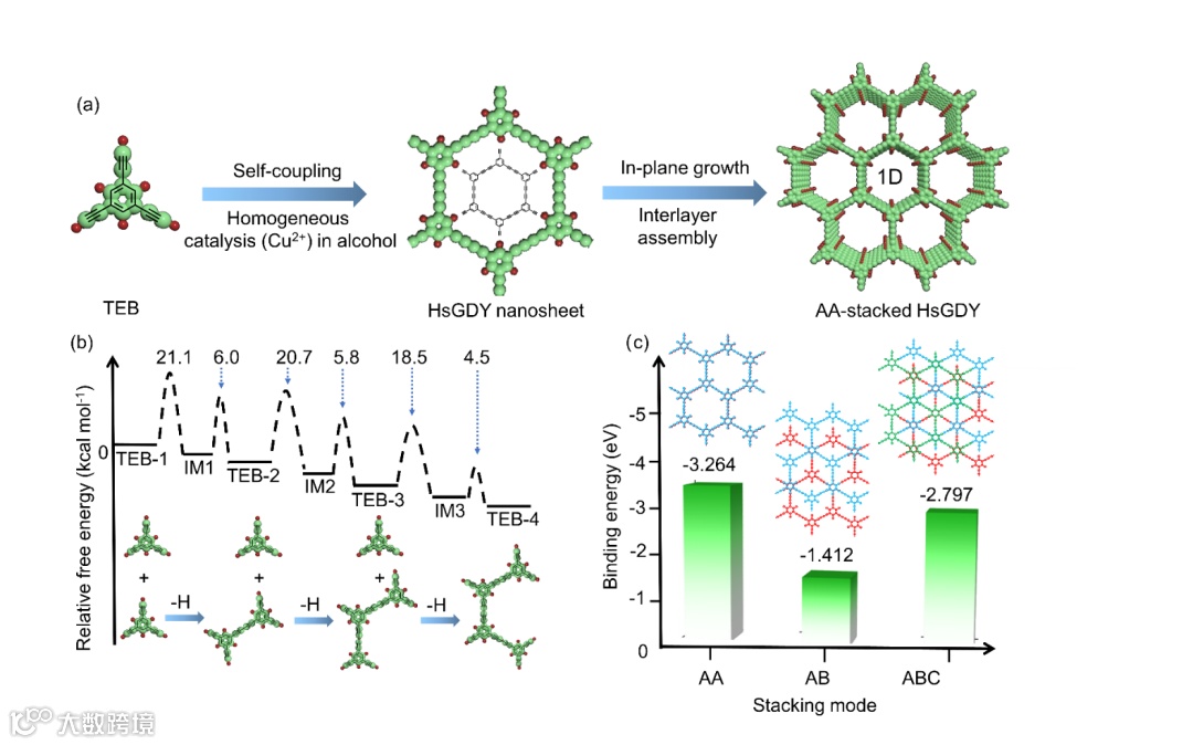 图1. (a)醇热法合成 AA 堆叠 HsGDY 的示意图;(b) 计算的 TEB 单体偶联成环状结构(IM,中间体的缩写)过程中逐步反应的能垒;(c) 不同堆叠模式下 HsGDY 的结合能计算。