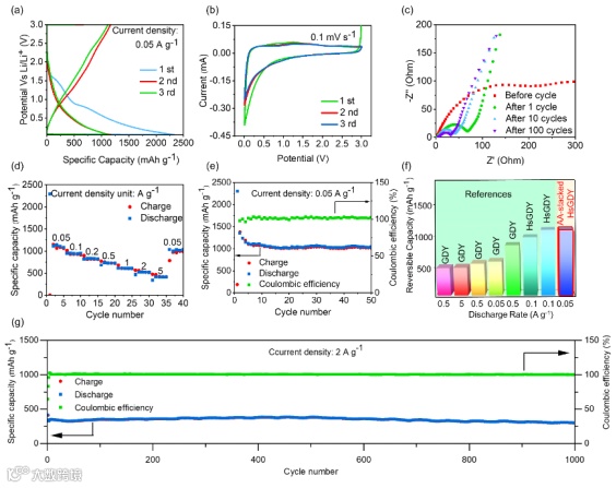 图 2.(a)AA 堆叠HsGDY电极在0.05 A g-1电流密度下的充放电曲线;(b)AA 堆叠 HsGDY 电极在0.1 mV s-1扫描速率下的 CV 曲线;(c)AA 堆叠 HsGDY 电极在0.05 A g-1电流密度下循环前后的奈奎斯特图(d) AA 堆叠 HsGDY 电极的倍率性能;(e)AA 堆叠 HsGDY 电极在0.05 A g-1下的循环性能;(f)其他各种基于 GDY 的负极材料之间的可逆容量比较;(g)AA 堆叠 HsGDY 电极在2 A g-1下的循环性能。