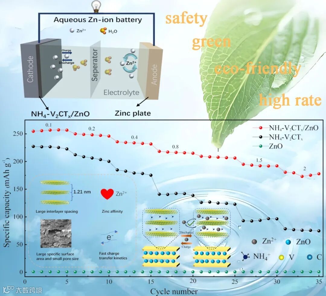 基于此,本研究报道了一种结合亲锌工程和层间距优化的新方法,以显著提高V2CTx的锌离子存储容量。首先,通过不同的离子预插层来调节V2CTx的层间距。系统研究了不同离子(NH4+、Na+、K+)预插层对V2CTx储锌性能的影响。NH4+预嵌V2CTx(表示为NH4-V2CTx)具有更大的层间距,并表现出更好的电化学性能。为了加速NH4-V2CTx的Zn2+动力学,通过溶剂热法在其层间和表面均匀生长亲锌ZnO纳米粒子。ZnO纳米粒子的耦合显著降低了Zn2+在NH4-V2CTx中的迁移势垒,并进一步提高了NH4-V2CTx的电化学活性。此外,ZnO修饰的NH4-V2CTx复合材料(NH4-V2CTx/ZnO)阴极还显示出增大的比表面积和高度稳定的二维分层结构,这不仅表现出优异的倍率容量,而且显著延长了循环寿命。这项工作开创了亲锌工程电极材料改性新策略,为提高AZIBs阴极材料的锌储存性能提供了有效的途径和新的视角。其相关成果发表在国际知名期刊Small上,题为“Interlayer Spacing Optimization Combined with Zinc-philic Engineering Fostering Efficient Zn2+ Storage of V2CTx MXenes for Aqueous Zinc-Ion Batteries”。值得注意的是,这项研究是南昌大学周耐根、瞿国兴教授与清华大学危岩教授再度联手发表的又一重要成果,此前他们合作的关于水系锌离子电池各类阴极材料研究现状的综述文章被材料学领域顶级期刊Progress in Materials Science(IF=33.6)于2024年10月28日在线发表(https://doi.org/10.1016/j.pmatsci.2024.101393)。