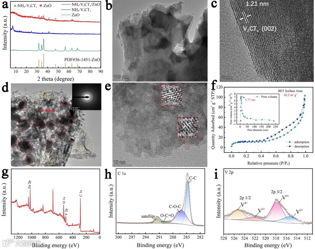 图2. (a) NH4-V2CTx/ZnO、NH4-V2CTx和ZnO的XRD图谱;(b) 制备的NH4-V2CTx薄片的TEM图像;(c) 制备的NH4-V2CTx薄片的HRTEM图像;(d) 制备的NH4-V2CTx/ZnO的TEM图像和SAED图案(插图);(e) 制备的NH4-V2CTx薄片的HRTEM图像;(f) NH4-V2CTx/ZnO的N2吸附-解吸等温线和相应的孔径分布(插图);(g) NH4-V2CTx/ZnO的XPS全谱图;(h) NH4-V2CTx/ZnO的XPS C 1s光谱;(i) NH4-V2CTx/ZnO的XPS V 2p光谱.