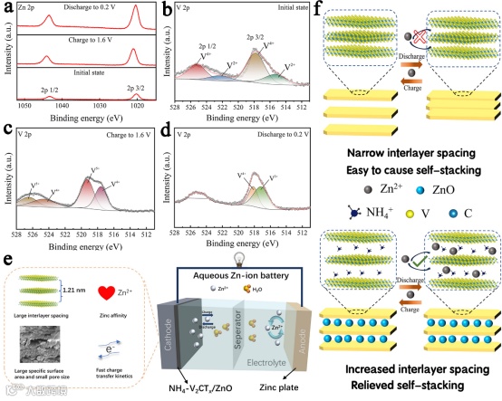 图6. (a) Zn 2p在初始、完全放电和充电状态下的非原位高分辨率XPS光谱;(b) V 2p在初始状态下的非原位高分辨率XPS光谱;(c) V 2p在完全充电时的非原位高分辨率XPS光谱;(d) V 2p在完全放电时的非原位高分辨率XPS光谱;(e) 电池模型、反应机理和阴极特征示意图;(f) NH4+预插层与ZnO纳米粒子修饰协同作用机理示意图.
