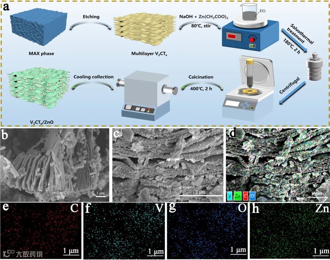 图1. (a) NH4-V2CTx/ZnO材料制备工艺示意图;(b) NH4-V2CTx的SEM图像;(c) NH4-V2CTx/ZnO的SEM图像;NH4-V2CTx/ZnO的(d-h)EDS能谱图.