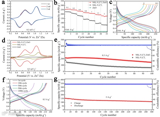 图3. (a) NH4-V2CTx/ZnO阴极在0.3 mV s-1下的CV曲线;(b) NH4-V2CTx/ZnO、NH4-V2CTx和ZnO阴极在0.1、0.2、0.4、0.8、1、1.5和2 A g-1下的倍率性能;(c) NH4-V2CTx/ZnO阴极在0.1、0.2、0.4、0.8、1、1.5和2 A g-1下的GCD曲线;(d) NH4-V2CTx/ZnO、NH4-V2CTx和ZnO阴极在0.3 mV s-1下的CV曲线;(e) NH4-V2CTx/ZnO和NH4-V2CTx阴极在0.5 A g-1下的循环性能;(f) NH4-V2CTx/ZnO阴极在0.5A g-1下不同循环次数下的GCD曲线;(g) NH4-V2CTx/ZnO阴极在2 A g-1下的长循环性能.