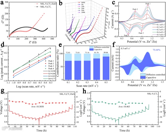 图4. (a) NH4-V2CTx/ZnO和NH4-V2CTx阴极的Nyquist图;(b) NH4-V2CTx/ZnO阴极的原位EIS分析;(c) NH4-V2CTx/ZnO电极在不同扫描速率下的CV曲线;(d) log(i)与log(v)的曲线图以及(a)中的相应b值;(e) 0.1-0.5 mV s-1下计算出的电容和扩散贡献之比;(f) NH4-V2CTx/ZnO的CV在0.3 mV s-1时对阴极过程具有表面主导容量贡献;(g-h)NH4-V2CTx/ZnO和NH4-V2CTx电极的GITT曲线和计算的离子扩散系数。