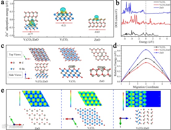 图5. (a) V2CO2/ZnO、V2CO2和ZnO模型对Zn2+的吸附能。插图提供了相应的差分电荷密度图,其中黄色和蓝色分别表示电子积累和消耗;(b) DOS用于V2CO2、V2CO2/ZnO和ZnO;(c) V2CO2/ZnO、V2CO2和ZnO晶格中Zn2+的迁移轨迹以及(d)DFT计算模拟的相应迁移能垒;(e) V2CO2/ZnO、V2CO2和ZnO的ELF等高线图。