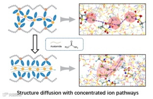2023年,团队通过引入商业化的聚阴离子电解质—双极性配体共熔化学,成功将原本难以传导阳离子的磺化离聚物转化为高效的单阳离子导体(ACS Energy Lett., 2023, 8, 4923−4931)。我们发现,引入的双极性配体(如乙酰胺)通过局部阳离子溶剂化和特殊的阴离子键合作用,能够自发地解离紧密的阳离子-阴离子对,且不影响刚性聚苯乙烯主链的固有性质。这种共熔相互作用有效地扩大了离子富集相分离域,为阳离子沿着不稳定的配位位点迁移创造了理想的渗透通道,从而实现了阳离子迁移与聚合物动力学的解耦。实验数据表明,在仅添加适量配体的情况下,对含有不同阳离子(如Li+,Na+,Mg2+和Zn2+)聚苯乙烯磺酸盐的电导率均得到显著提升,超过10-5 S cm-1),相较于原始离聚物提高了至少4个数量级。
