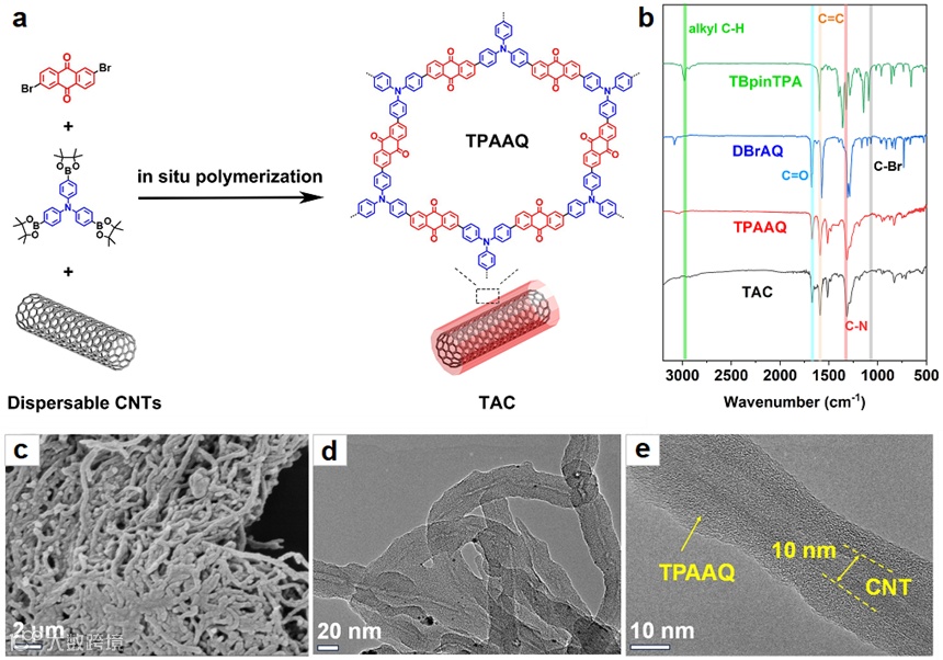 通过将p型三苯胺单元接枝到n型蒽醌上,从而形成扩展的π-共轭结构,并在碳纳米管上原位生长,合成了一种新型双极聚合物复合材料(TAC),具有管状核壳结构。研究表明,该材料不仅具有更高的放电电位,而且有效地抑制了溶解问题。