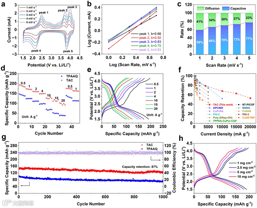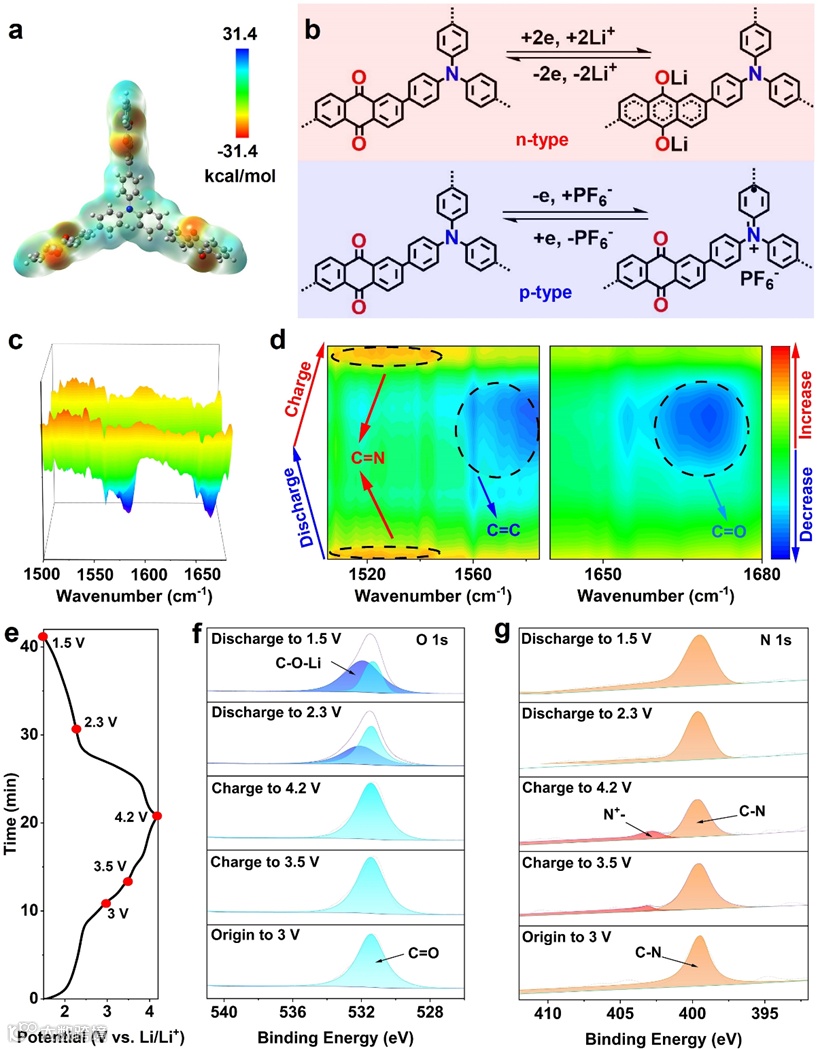通过原位红外以及非原位X射线光电子能谱表征了在不同充放电状态下TAC电极的活性基团变化。结果表明,TAC具有双离子存储机制,能结合n型蒽醌基团和p型三苯胺基团的优势在低电位和高电位下分别存储Li+和PF6-。