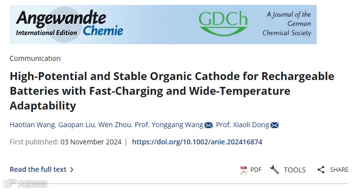近日,复旦大学董晓丽、王永刚教授团队在国际知名期刊Angewandte Chemie International Edition上发表题为“High-Potential and Stable Organic Cathode for Rechargeable Batteries with Fast-Charging and Wide-Temperature Adaptability”的文章。有机羰基化合物通常具有较低的氧化还原电位并且其本身或其放电产物易溶解于电解液中。为解决以上问题,本文设计了一种新型的双极性聚合物复合物材料,具有高容量、长循环稳定性、优异的倍率性能以及高质量负载。该材料所组成的有机物电池具有优异的快充和宽温性能,为有机物电极的实际应用提供了指示。