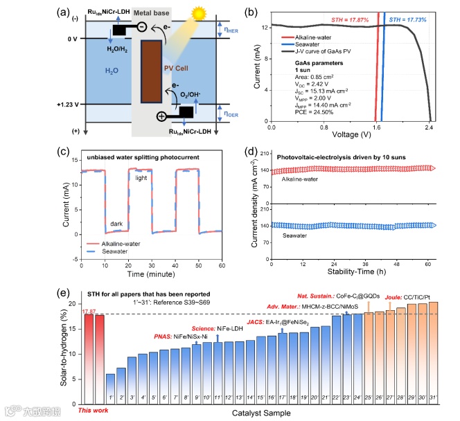 同时构建了可有效利用可再生能源太阳能的“光伏-电解系统”,并整合RuldsNiCr-LDH催化剂应用于该系统。结果,光伏-电解海水系统实现了17.73%的STH效率,位于文献报道的第一梯队。通过对文献报道的所有光伏-电解系统的研究发现,不同论文所使用的光伏板的光电转换效率(PCE)、类型、造价各不相同,这使该系统的STH效率的横向对比失去了意义。因此,本文首次提出了PVTH(Photovoltaic-to-hydrogen,光伏至氢)效率参数:PVTH = STH / PCE,使用PVTH效率时可以忽略光伏板的差异。本文构建的光伏-电解海水系统展现出72.37%高的PVTH效率。