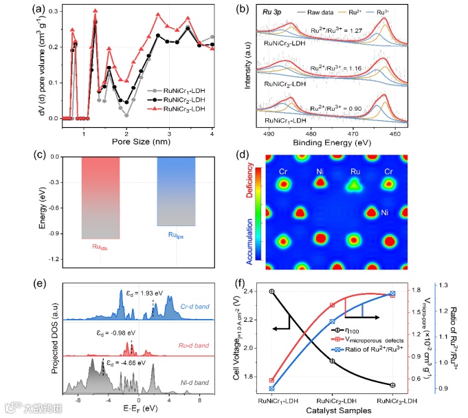 本工作深入的结构分析解释了RuldsNiCr-LDH的活性、耐久性起源。Ru原子被精准地锁定在微/介孔缺陷晶格位,诱导产生高度暴露的Ni-O-Ru催化活性中心。稳健的Cr位电子平衡库在动态电解过程中平衡了Ni-O-Ru活性单元电子的增益与损失,而插层CO32-通过孔缺陷和层间距静电排斥腐蚀性Cl-,共同赋予RuldsNiCr-LDH耐久的催化活性。