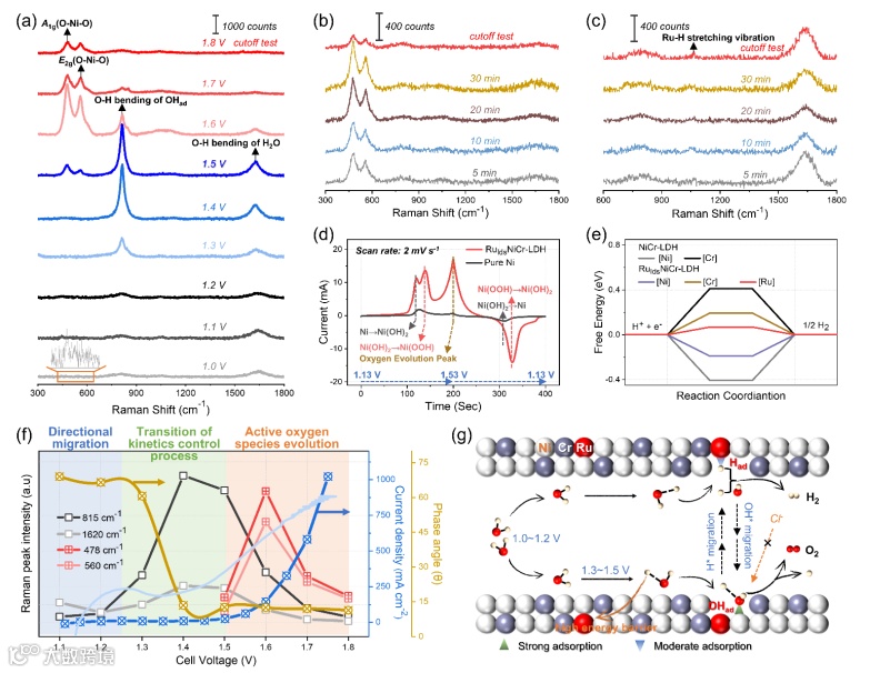 涉及界面水的动态演变机制阐述了界面水动态行为和RuldsNiCr-LDH催化水电解的活性、动力学间的相关性。本文划分了三个阶段:定向迁移、振动-解离、活性氧物种演化,其中界面水的“振动-解离”与动力学控制过程(KCP)的转变有关,促进三相界面反应(TPI-R)的发生;“活性氧物种演化”则决定了催化剂的活性。