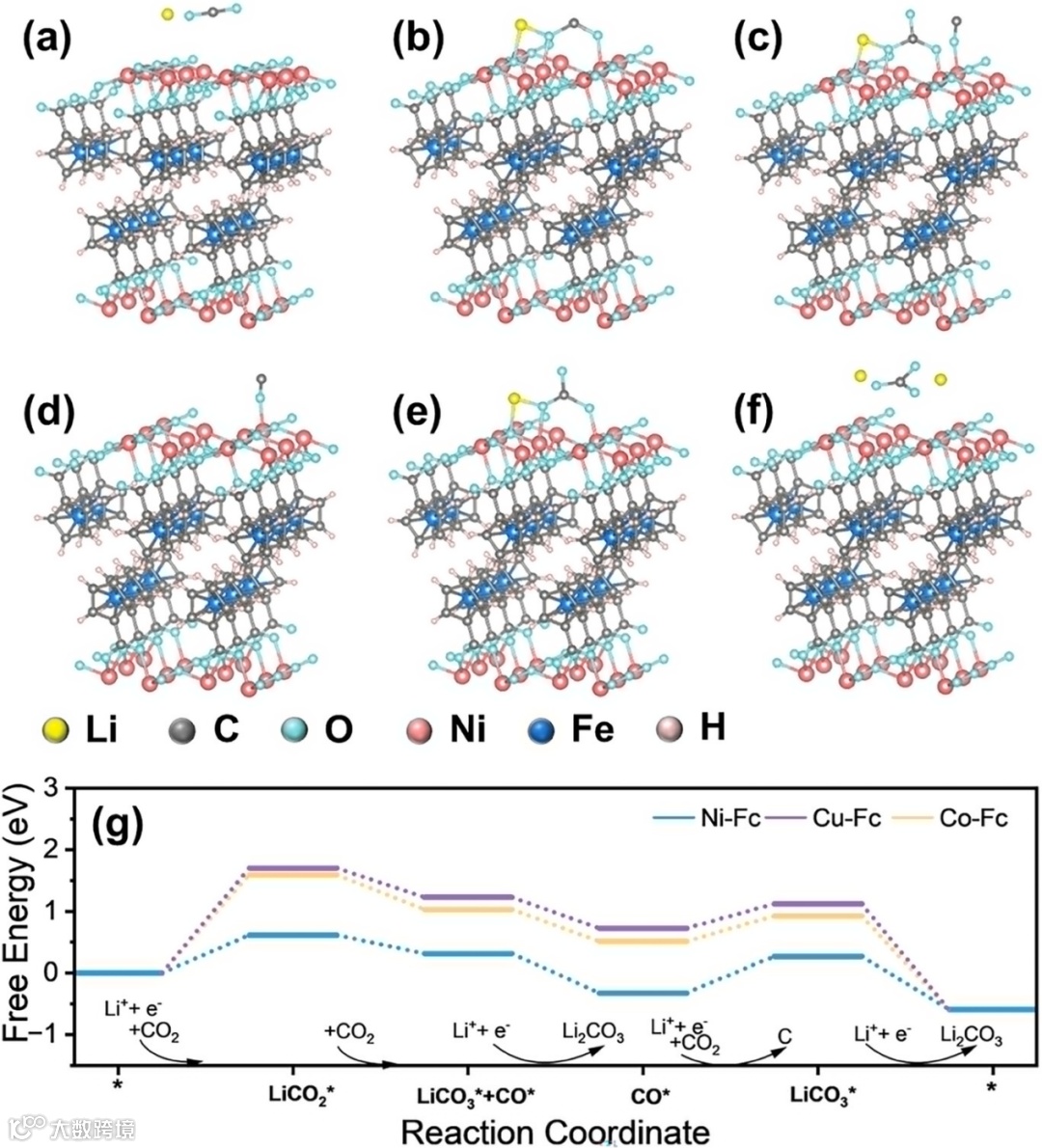 图4. (a–f) Li-CO₂电池放电过程中在Ni-Fc模型上的优化结构及中间体吸附;(g) Ni-Fc、Cu-Fc和Co-Fc模型放电过程的反应自由能图。