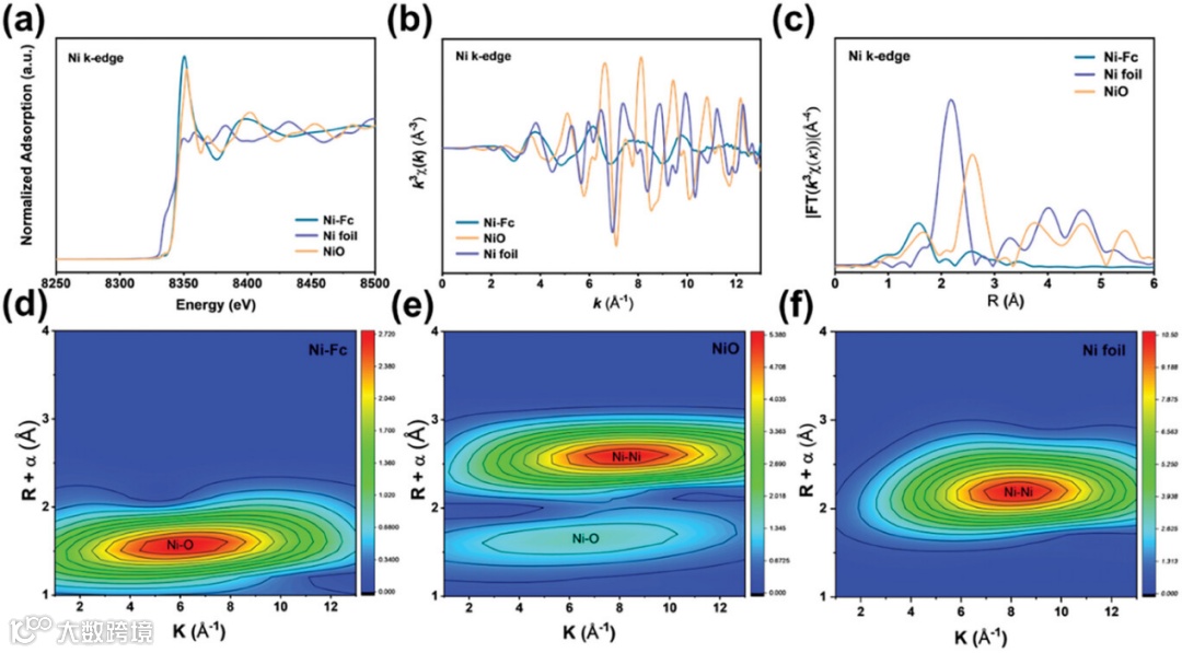 图2. Ni-Fc的XAFS分析。(a) XANES光谱;(b) k边EXAFS光谱;(c) EXAFS的R边实验结果;(d) Ni-Fc的WT-EXAFS图;与(e) NiO和 (f) Ni箔样品进行比较。