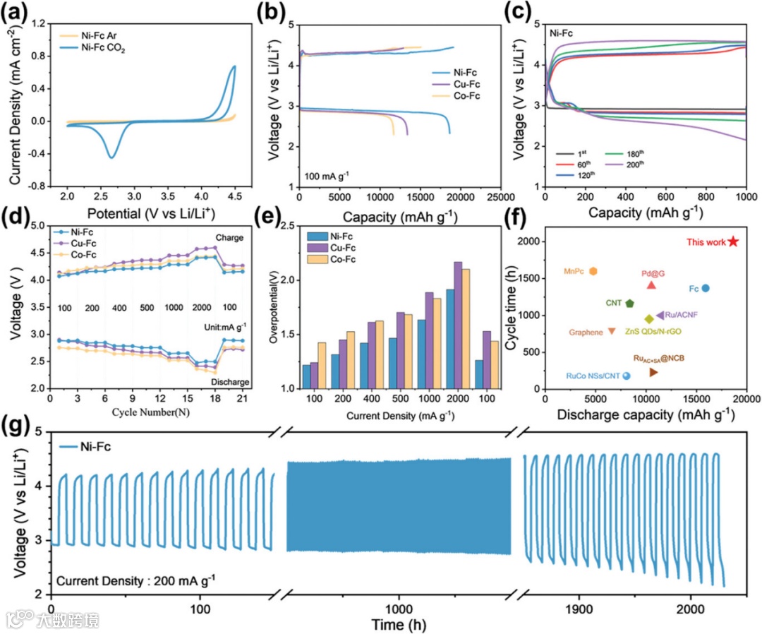 图3. Ni-Fc、Cu-Fc和Co-Fc在定容量为1000 mAh g⁻¹的Li-CO₂电池中的电化学性能。(a) 在Ar和CO₂气氛下扫描速率为0.1 mV s⁻¹的CV曲线;(b) Ni-Fc、Cu-Fc和Co-Fc在100 mA g⁻¹下的完全充放电容量;(c) Ni-Fc在200 mA g⁻¹下的循环性能,(d) 倍率性能;(e) Ni-Fc、Cu-Fc和Co-Fc电池在100到2000 mA g⁻¹电流密度下的过电位;(f) Ni-Fc与已报道的高性能Li-CO₂电池催化剂性能比较;(g)Ni-Fc在200 mA g⁻¹下的电压/时间曲线。