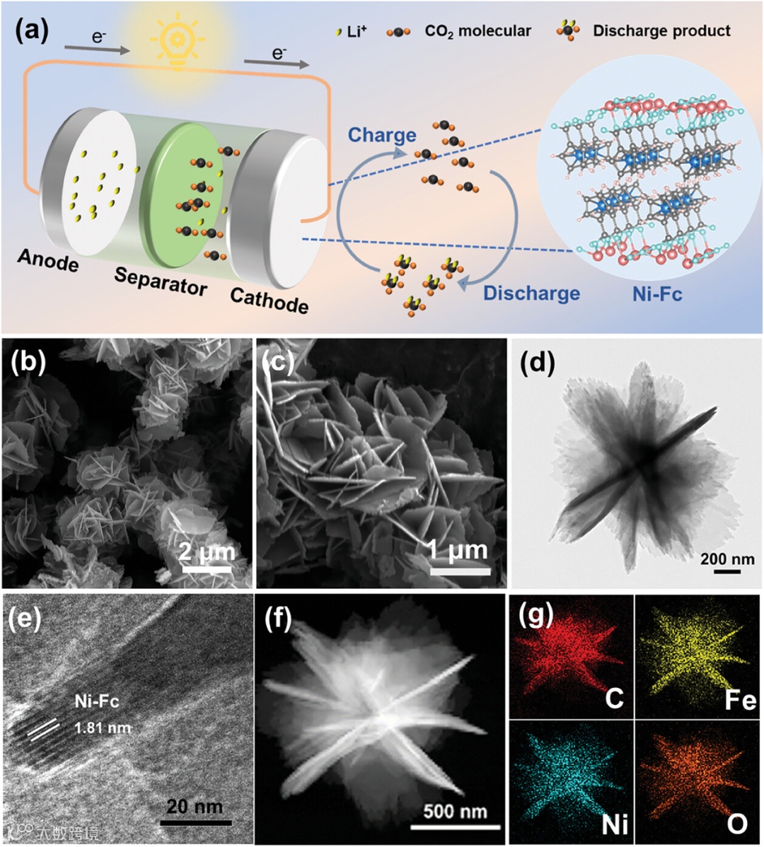 图1. (a) Ni-Fc催化剂Li-CO2电池工作原理图; (b, c) Ni-Fc SEM图像;(d, e) TEM图像;(f) STEM图像; (g)相应的C、Fe、Ni、Cu的EDS mapping图像。