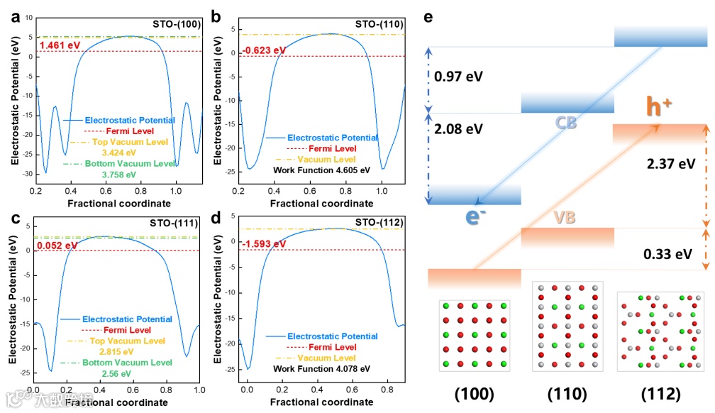利用DFT模拟计算证实,在该SrTiO3不同晶面之间的功函数差异能够形成强大的内置电场,促进光生载流子的有效分离。特别是其{100}晶面和{112}晶面之间的电场有助于电子集中于{100}晶面上,而空穴则集中在{110}和{112}晶面上。{110}晶面起到了连接其他两个晶面间电荷传输的桥梁作用,从而提高了光催化过程中电荷的利用效率。