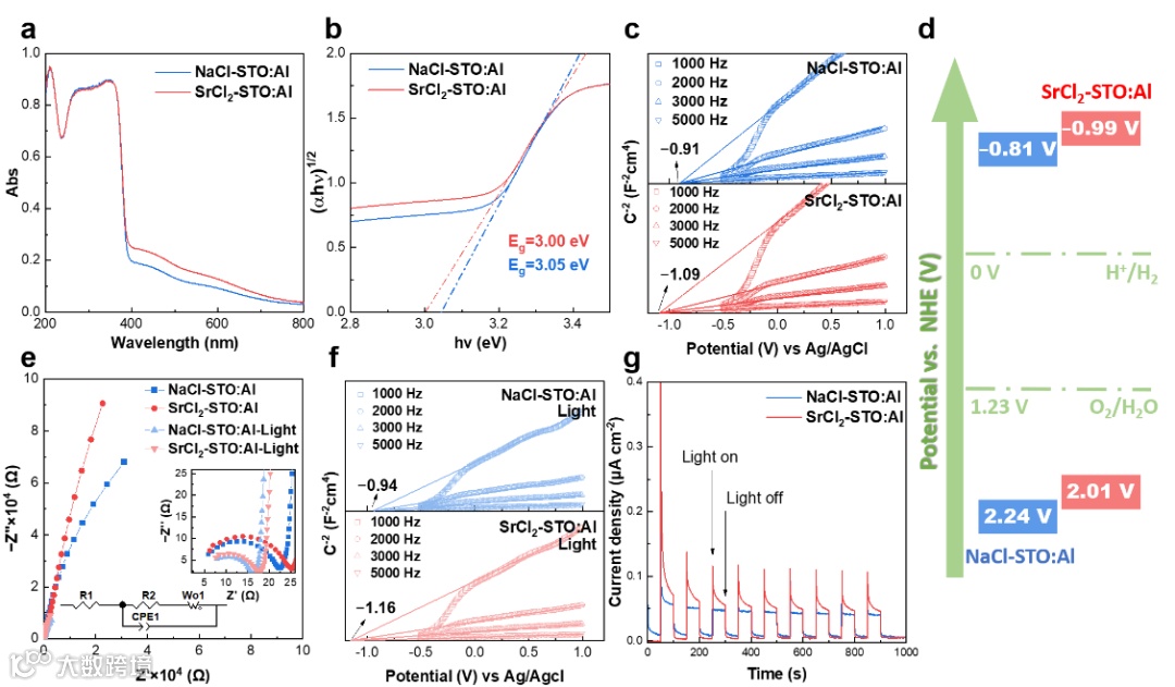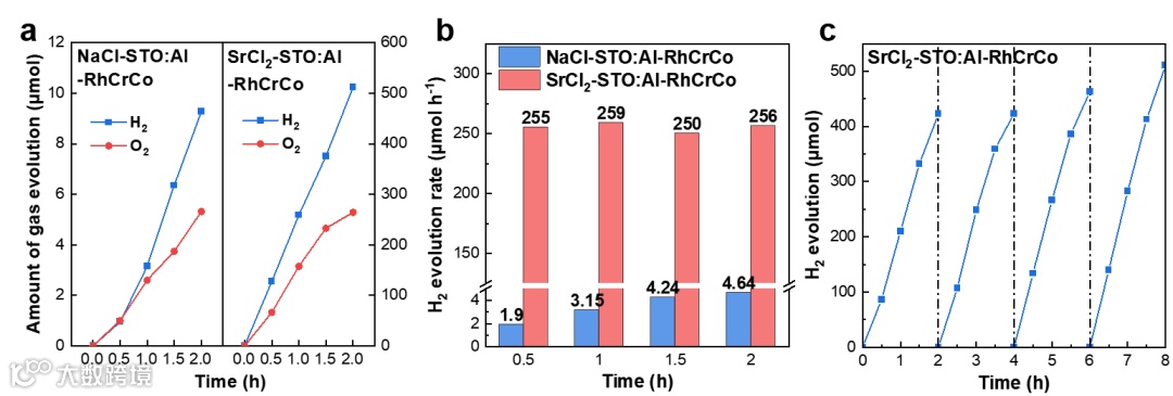 实验结果显示,经过SrCl2处理并负载助催化剂RhCrOx/CoOx后,SrTiO3:Al的平均析氢速率比使用NaCl处理的样品高出64倍,达到了255 μmol h-1。这说明优化后的SrTiO3:Al不仅在结构上更加优越,而且在实际应用中展现了出色的光催化水分解能力。此外,随着助催化剂含量的增加,平均氢气演化速率进一步提高至319 μmol h-1,相应的量子产率为3.5%(365 nm),推算得出太阳能到氢能转换效率为0.181%。