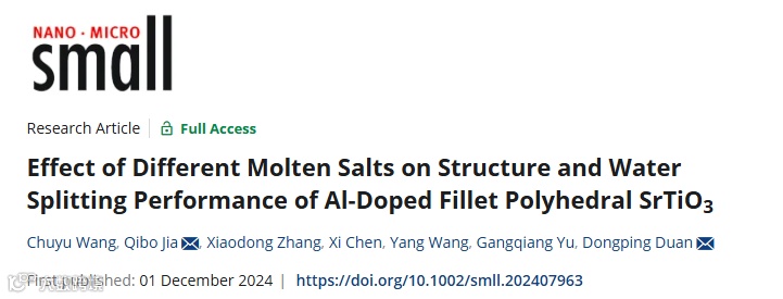 近日,中国科学院过程工程研究所段东平研究员团队,在国际知名期刊Small上发表题为“Effect of Different Molten Salts on Structure and Water Splitting Performance of Al-Doped Fillet Polyhedral SrTiO3”的文章。该团队致力于研发一系列新颖的SrTiO3光催化剂,本文报道的催化剂同时表现出各向异性晶面并保持最小内部缺陷密度,以期显著增强其在光催化水分解制氢反应中的效能。