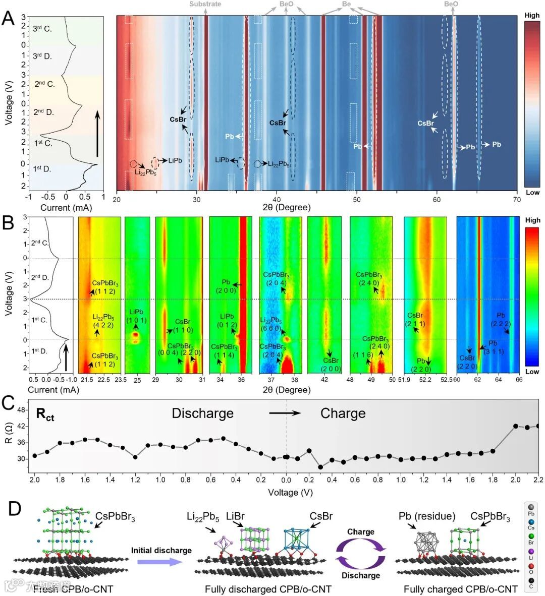 通过原位XRD、原位EIS和非原位TEM等表征技术,详细研究了CsPbBr₃在锂化过程中的结构变化。结果表明,CsPbBr₃在锂化过程中经历了插层-转化-合金反应,生成了CsBr、LiBr、Pb和Li₂₂Pb₅等中间相。充电过程中,这些中间相能够可逆地重新形成CsPbBr₃,揭示了其结构演变的可逆性。