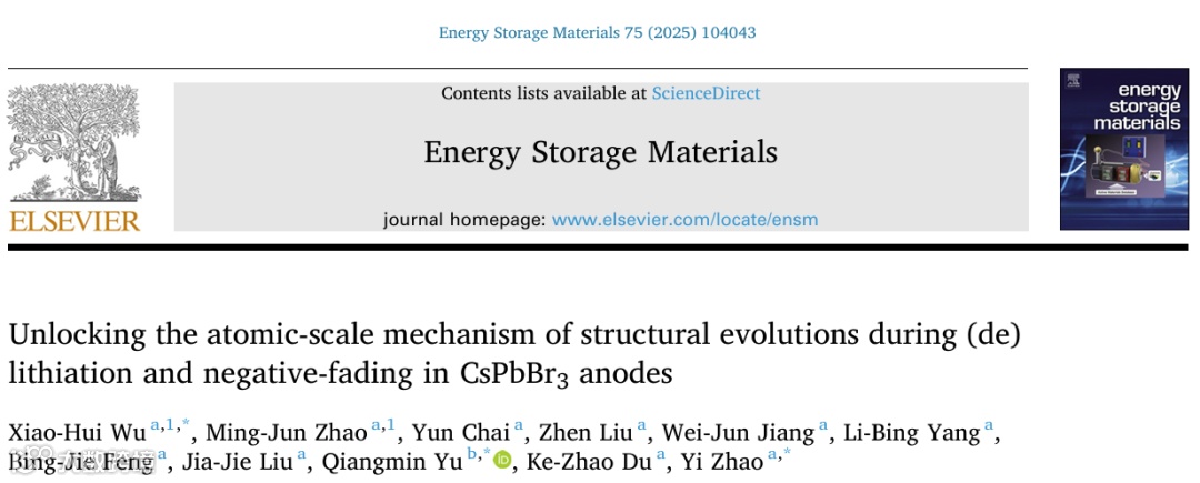近日,来自福建师范大学的吴小慧副教授与赵毅研究员等人合作,在国际知名期刊Energy Storage Materials上发表的题为“Unlocking the atomic-scale mechanism of structural evolutions during (de)lithiation and negative-fading in CsPbBr3 anodes”的文章。该文章通过各种原位/非原位技术全面研究了CsPbBr3 的结构演变,揭示了其在锂化过程中通过插层-转化-合金反应产生 CsBr、LiBr、Pb和Li22Pb5相,并在充电过程中可逆形成CsPbBr3 。此外,将CsPbBr3 颗粒嵌入导电碳纳米管(o-CNT)中,可充分利用其逆衰减现象。综合实验和理论分析表明,CsPbBr3 增强的逆衰减现象主要源于两方面:负载在o-CNT 上的残留 Pb金属的锂合金化反应以及循环过程中活性材料尺寸减小的导致的增强赝电容贡献。因此,这项工作不仅揭示了CsPbBr3 的电化学(脱)锂化机制,还提出了一种有效的策略来增强卤化物钙钛矿材料的“逆衰减”效应,以实现优异的储锂性能。