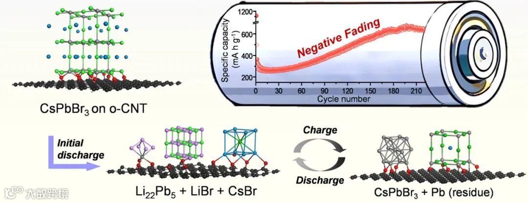 金属卤化物钙钛矿材料因其独特的电子和离子传输特性而引起了锂离子电池的广泛研究关注。然而,金属卤化物钙钛矿在锂储存过程中相变的原子尺度机制在很大程度上仍未得到探索。此外,一些电池材料有着容量“逆衰减”的现象,即随着循环数的增加,电池容量出现增长的现象。通过有效的增强和利用电池容量“逆衰减”,可以加速下一代新型电池的发展。