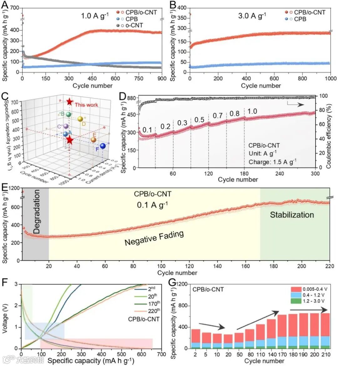图3制备样品的锂离子储存性能:o-CNT、CPB和CPB/o-CNT电极在 (A) 1.0 A g⁻¹ 和 (B) 3.0 A g⁻¹ 条件下的循环性能。(C) CPB/o-CNT与其他报道的钙钛矿基材料用于锂离子电池负极的循环性能对比。(D) CPB/o-CNT电极在充电电流密度为1.5 A g⁻¹及不同放电电流密度(0.1-1.0 A g⁻¹)下的快充慢放性能。(E) CPB/o-CNT电极在0.1 A g⁻¹条件下的循环性能,分为电池容量衰减;逆衰减;稳定三个区域。(F) 在第2、20、170和220次循环时的充放电曲线对比。(G) CPB/o-CNT电极在指定循环次数下,在0.1 A g⁻¹条件下、0.005-3.0 V电压范围内,三个电压区域的计算比容量。