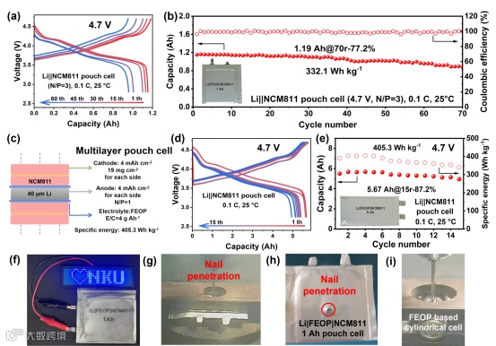 采用超高容量、最低电位的锂金属作为负极时,使用FEOP的电池能够实现更高的能量密度。以NCM811为正极,20 µm锂箔为负极组装的固态锂金属软包电池,标称比容量为1 Ah,在0.1 C和4.7 V的截止电压下,能量密度可达332.1 Wh kg-1,且可稳定循环70圈。为了进一步突破400 Wh kg-1的高能量密度,组装一个标称容量为5 Ah的软包电池。在4.7 V的截止电压下工作时,该软包电池的实际能量密度高达405.3 Wh kg-1。此外,使用FEOP组装的软包电池和柱状电池不仅能够点亮灯牌,还通过了工业标准的针刺测试。上述结果表明, FEOP聚合物电解质在商业应用中具有显著优势,组装的固态电池在极端条件下均具有卓越的安全和性能表现。