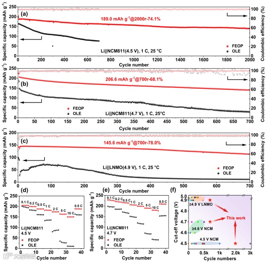 图3. FEOP在搭配多种高压正极材料条件下的超长循环稳定性。