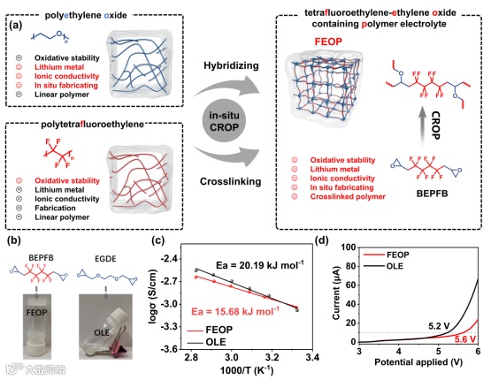 通过本文章提出的交联剂BEPFB,研究者成功将大量氟原子引入聚合物主链中,此种强吸电子基团能够增强聚合物的氧化稳定性。同时,BEPFB上的两个环氧乙烷还可以作为阳离子开环聚合活性官能团实现聚合物在电池中的原位制备,并向链段中引入醚氧键提高聚合物的锂离子传输能力。最终,通过BEPFB原位聚合获得的主链氟代聚合物电解质FEOP,具有1 mS cm−1的室温离子电导率和高达5.6 V的氧化稳定电位。