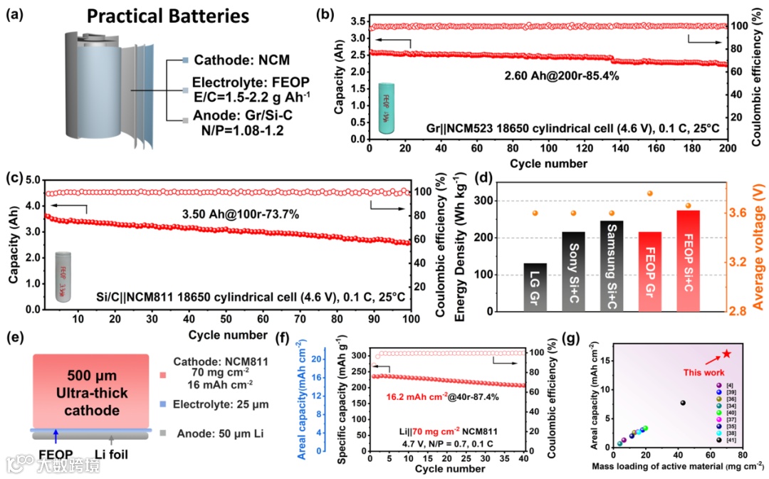 图4. 使用FEOP组装18650柱状电池与超高负载正极全电池的参数与循环性能。