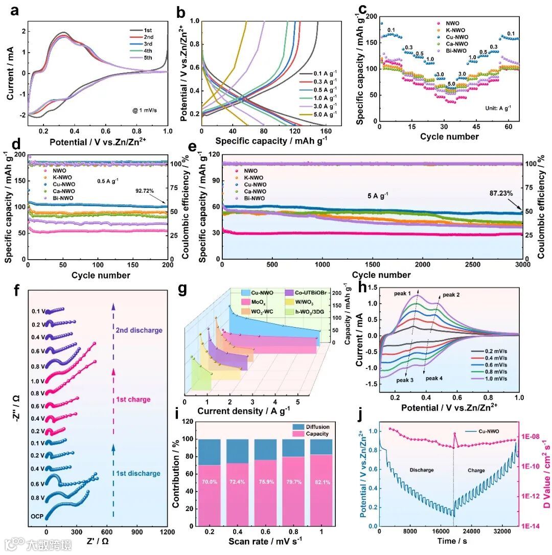 由于Cu2+掺杂占据了部分W位点,形成了丰富的空位和缺陷,产生了大量的活性位点,可以提供更高的电导率,更有利于Zn2+的快速传输。此外,NH4+可以作为材料的“结构支柱”来防止结构的坍塌。因此,Cu-NWO阳极在0.1 A g-1下的可逆容量为160.23 mAh g-1,在0.5 A g-1下循环200次后容量保持率为92.72%,表现出优异的倍率性能和循环能力。此外,较低的阻抗,较高的离子扩散系数以及高比例的赝电容贡献显示了其快速的反应动力学性能,表明该材料在“摇椅式”ZIBs应用中具有较大的潜力。