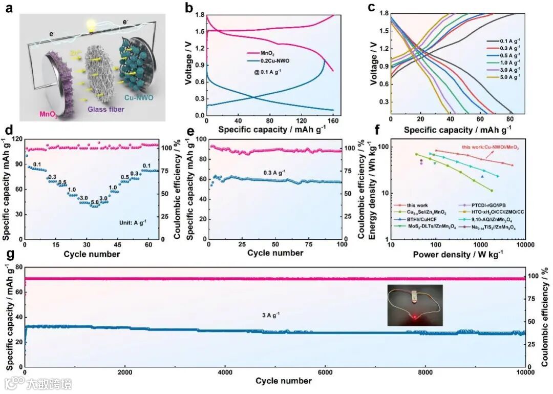 将Cu-NWO作为阳极,MnO2作为阴极,构建了摇椅式水系锌离子电池,探究其在储能领域中的应用。该全电池的电压窗口为0.1-1.8 V,放电电压约为1.03 V,比容量为82.35 mAh·g-1,可实现84 wh kg-1的能量密度以及超10,000次的稳定循环。