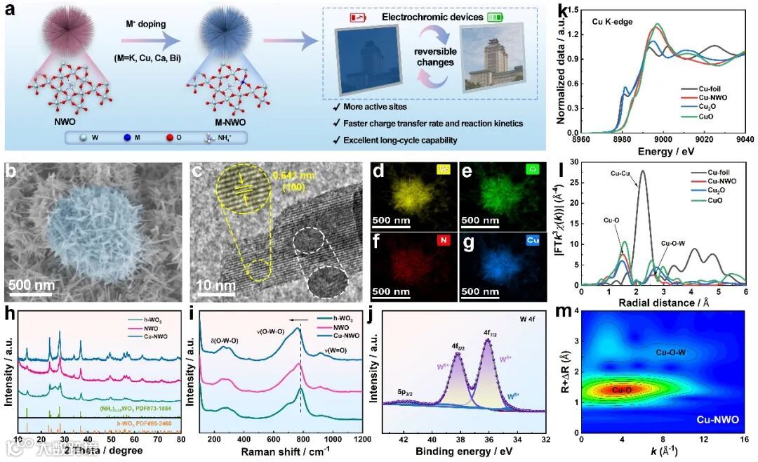 要点一:原位可控生长多重阳离子掺杂的Cu-NWO海胆状纳米花球,表征其物相组成及微观结构