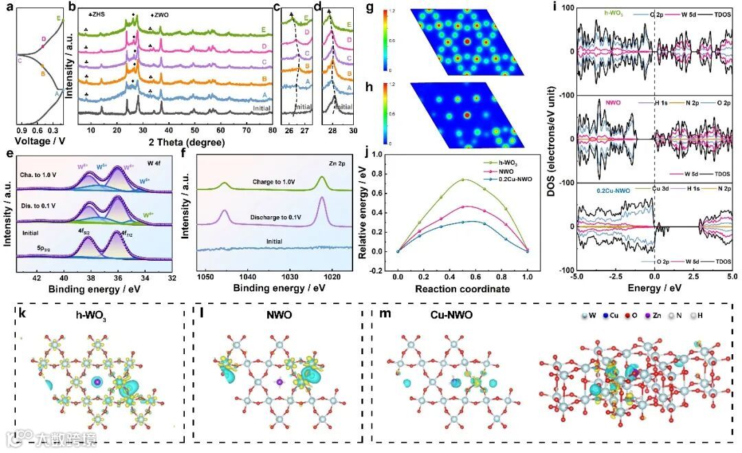 通过非原位XRD,XPS等表征手段阐述了Cu-NWO的H+/Zn2+共嵌入/脱出机制。通过密度泛函理论(DFT)计算研究多重阳离子掺杂对电化学性能提升的机制。结果表明,引入NH4+和Cu2+后,Cu-NWO的费米能级穿过价带,在价带附近产生掺杂能级,表现出半金属特征,使电子更容易从价带激发到导带,从而实现更快的电子输运。此外,最小的Zn2+扩散能垒表明多重阳离子掺杂有利于Zn2+在插层阶段的扩散。