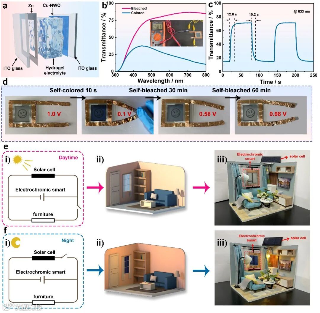 为了展示该材料在能量存储和转换中的潜在应用,组装了基于Cu-NWO的自供电电致变色装置, Cu-NWO//Zn器件在633 nm处的光调制率可达到62.74%。此外,该设备还展现了强大的实用功能,例如在智能窗户的应用,为节能减排提供了新的策略。