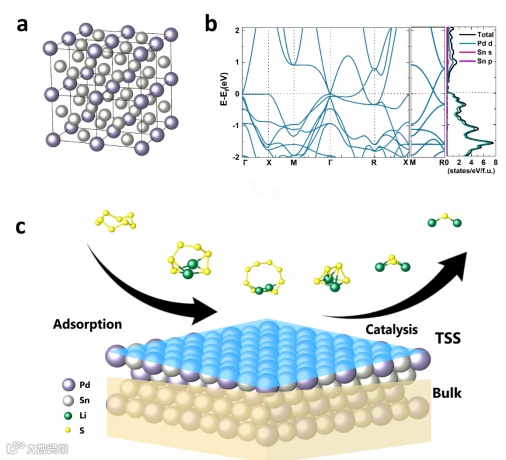 如图1所示,Pd₃Sn保持立方对称性,空间群为Pm¯3m(No. 221)。图1b展示的能带结构和态密度(DOS)表明Pd₃Sn具备半金属特性,导带和价带在Γ和R点交叉并形成节点,这是TSM的典型特征。这些特性促使表面电荷的量子化和快速电子传导,从而实现对LiPSs的强吸附和快速转化,使Pd₃Sn成为高效催化剂。