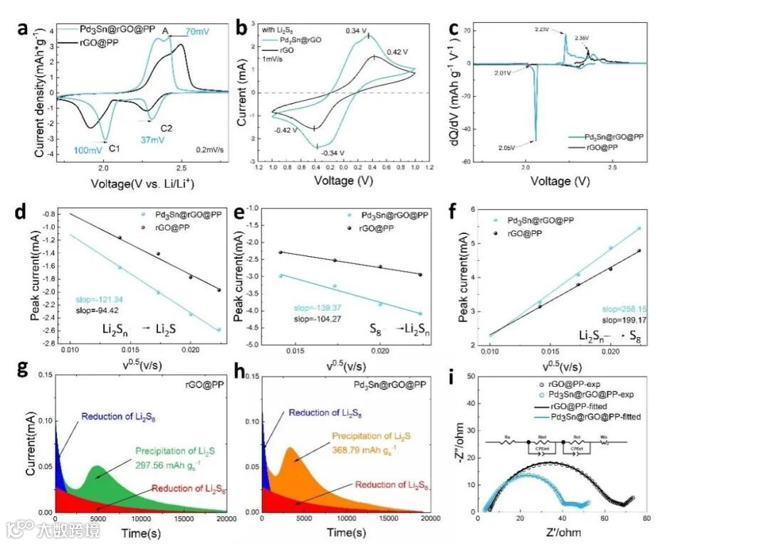 我们进一步对使用Pd3Sn@rGO改性的隔膜的电池进行电化学表征,CV测试证明Pd3Sn@rGO催化剂能显著促进多硫化物转化反应的发生并降低电池极化。同时,获得了比rGO更高的锂离子迁移率。Li₂S成核/溶解实验证实Pd₃Sn的TSS与Li₂S有强相互作用,并能促进多硫化物的双向转化。EIS实验同样证明Pd3Sn@rGO催化剂的优秀导电性有效降低了电池的界面转移电阻。